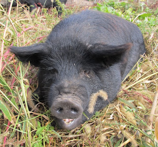 We now have American Guinea Hogs here at Wickham Farm. Guineas may be the perfect small farm pigs. They are a smaller size pig growing to weighing 100 to 300 pounds. They are easy to handle and produce a smaller, but high quality carcass. We hope to breed our new Guineas for spring 2012 farrowing and will have piglets and butcher hogs available later in the summer/fall.